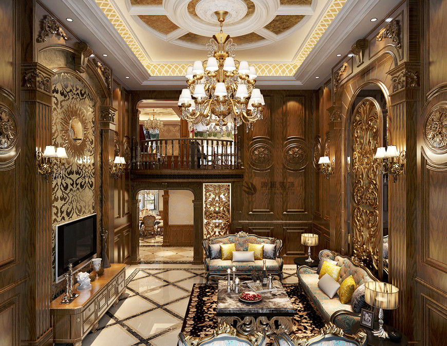 ▲曲江鳳凰池複式380平米古典歐式劉燕飛主筆(bǐ)設計——客廳電(diàn)視背景牆設計效果圖