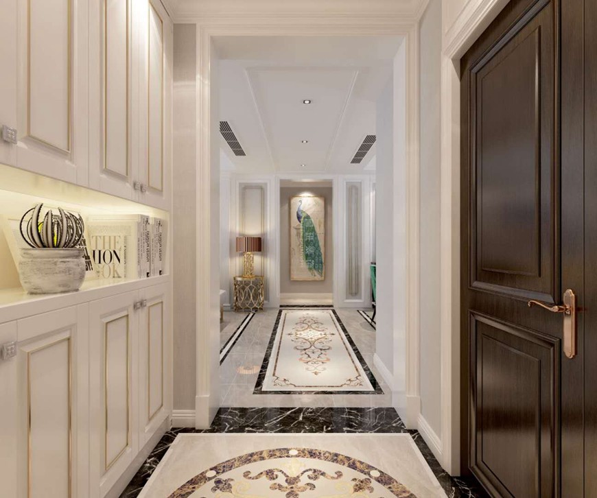 ▲西安(ān)魯班裝(zhuāng)飾華遠(yuǎn)楓悅140平米美式輕奢設計效果圖——門廳玄關設計