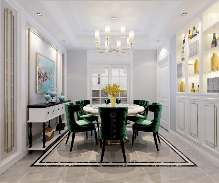 ▲西安(ān)魯班裝(zhuāng)飾華遠(yuǎn)楓悅140平米美式輕奢設計效果圖——餐廳設計