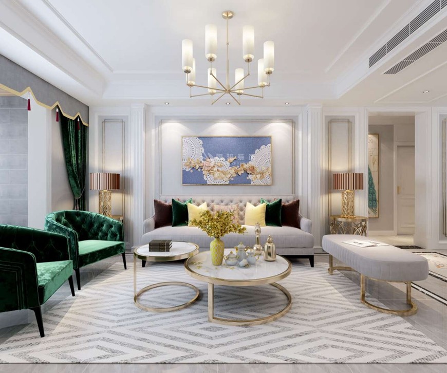 【設計說明】在客廳,設計融合了對美式與輕奢的梳理(lǐ)與吸納。在材料上,使用(yòng)木(mù)飾面和石材營造一種溫暖、自然、舒适的空間感受。簡化的石膏線(xiàn)條,浪漫高貴的沙發帶來經典的美式風味,金屬的點綴則讓空間自然而然地生發出了輕奢的質(zhì)感。用(yòng)色上,溫暖的黃與純淨的白,再加上高雅的孔雀綠,為(wèi)空間帶來了沒有(yǒu)距離感的生趣與豐富。在這裏,生活明朗,萬物(wù)可(kě)愛。