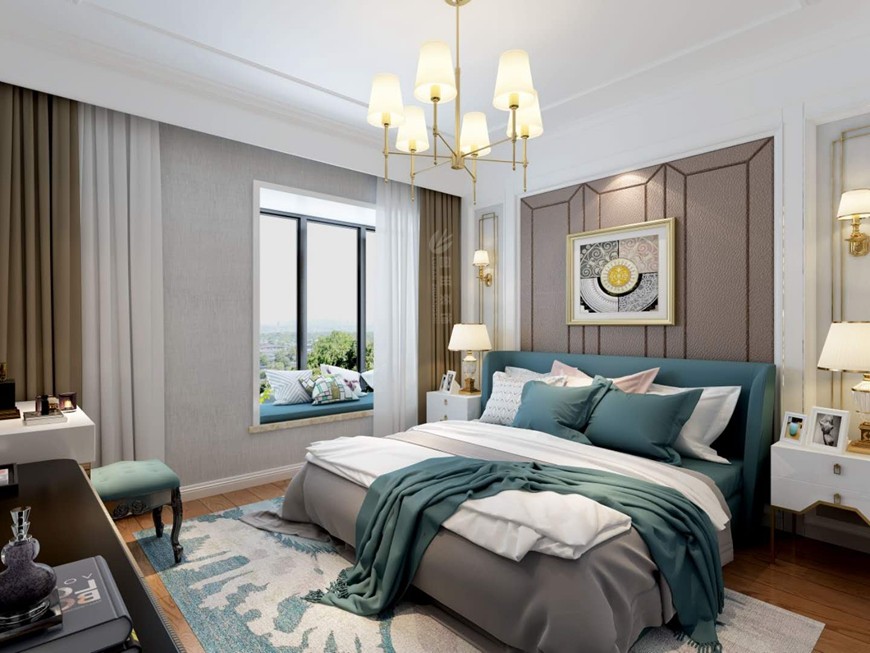 ▲西安(ān)魯班裝(zhuāng)飾華遠(yuǎn)楓悅140平米美式輕奢設計效果圖——主卧設計